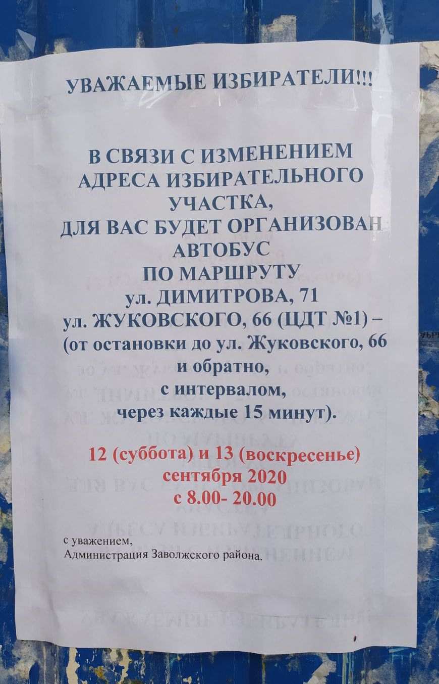 13-го сентября в соцсетях было опубликовано видео, автор которого заснял следующее: несколько избирателей входят в Центр детского творчества 1 (ул. Жуковского, 66). «Это подвоз! Вы нарушаете закон, этих людей только что массово подвезли на автобусе! Так запрещено делать!» - говорит, срываясь на крик, тот, кто снимает на смартфон. Затем автор видео подходит к водителю автобуса и выясняет, что его «наняла администрация Заволжского района».