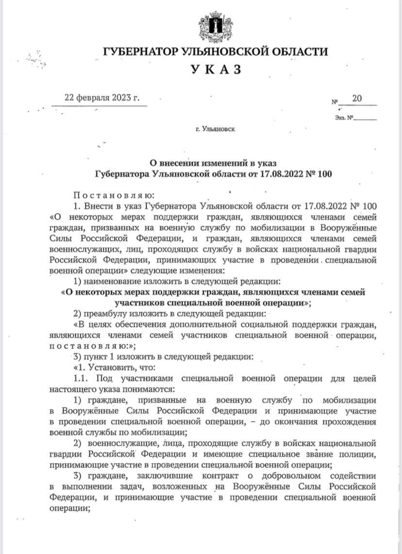 Губернатор Ульяновской области Алексей Русских подписал Указ о дополнительных мерах поддержки семей участников СВО