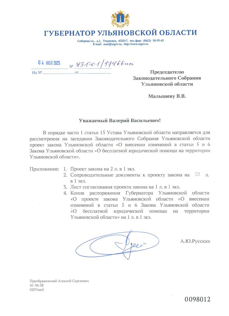 Законопроект «О внесении изменений в статьи 5 и 6 Закона Ульяновской области «О бесплатной юридической помощи на территории Ульяновской области» внесен в Законодательное Собрание Губернатором Ульяновской области Русских А.Ю. сегодня.
